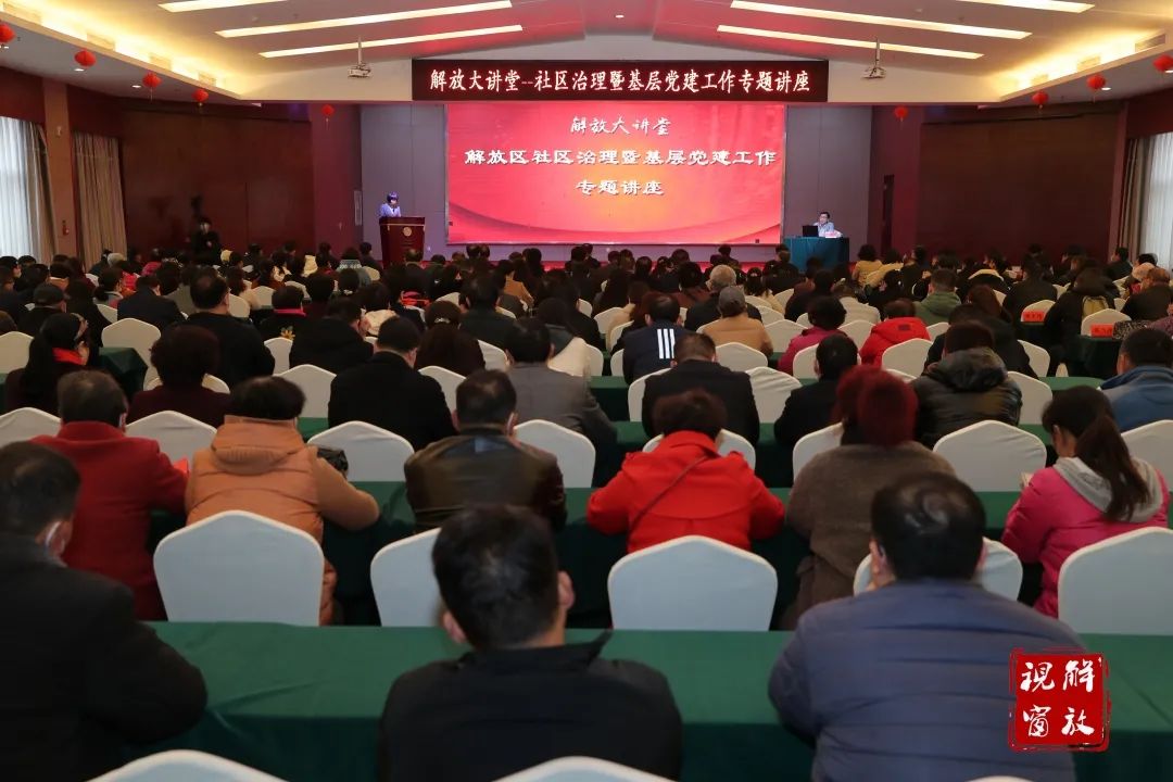 市委组织部副部长查仕成、部务委员秦杰出席讲座,解放区委副书记、区长赵海燕主持讲座;全区全体县级干部、区社区建设指导委员会成员单位负责人,各街道党工委书记、办事处主任、分管副职等300余人参加讲座。