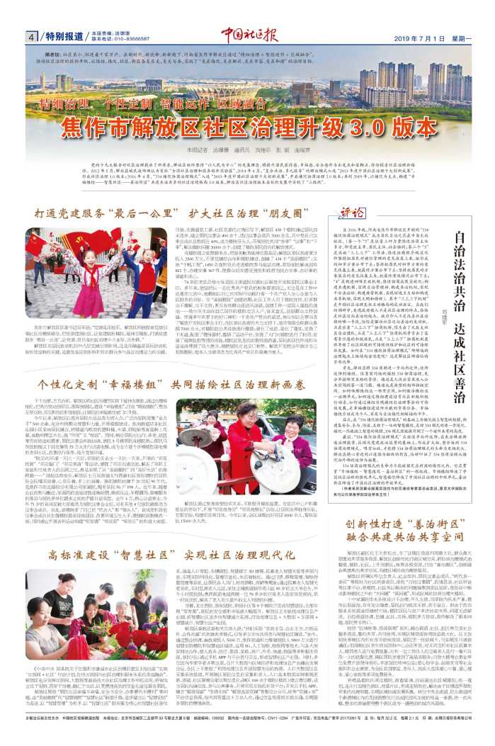 党的十九大报告对社区治理提出了新要求,解放区始终坚持“以人民为中心”的发展理念,将提升居民获得感、幸福感、安全感作为出发点和落脚点,持续探索社区治理新路径。2012年5月,解放区被民政部确认为首批“全国社区治理和服务创新实验区”,2014年4月,“复合共治、多元服务”的解放模式入选“2013年度中国社区治理十大创新成果”,形成社区治理1.0版本;2016年4月,“334楼院协商治理模式”入选“2015年度中国社区治理十大创新成果”,开启楼院协商治理2.0版本;再到2019年,以楼院为支点,构建“幸福楼组——智慧社区——善治街区”共建共治共享的社区治理格局3.0版本,解放区社区治理版本在创新发展中实现了“三级跳”。
