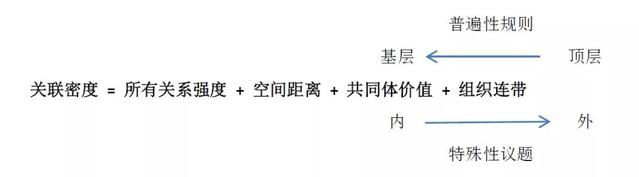 (四)关联物权治理之道。社区中由私有(专有)关系、相邻关系、共有关系、公共关系联结而成的关联网络;处于一种离散、变动状态的物业事件;珍视共同体价值而积极行动的社区领袖和志愿者;与物业管理职责相关的连带组织;这几种因素的组合,产生不同的关联密度。可以通过一种关系式来表达,即